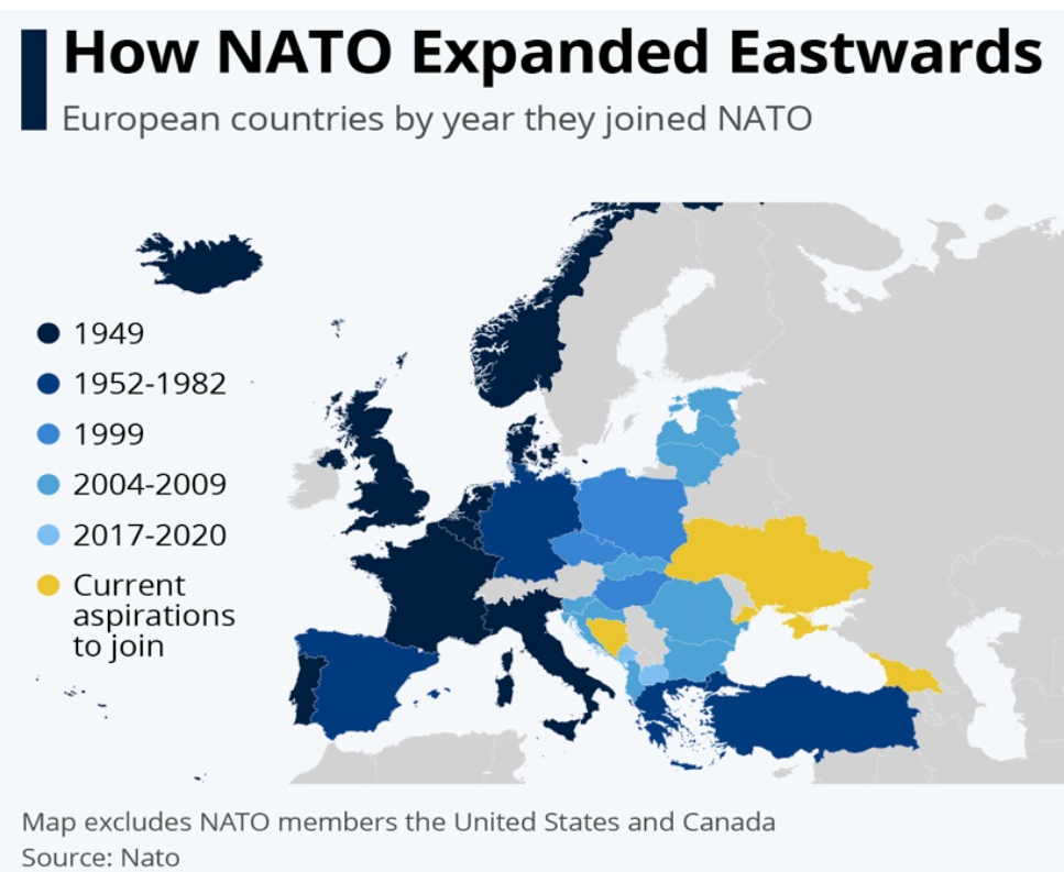 - American foreign policy experts: NATO should have never moved close to Russia’s borders. Russia perceives NATO as an existential threat. But NATO’s open-door policy says sovereign countries can choose their own security alliances.