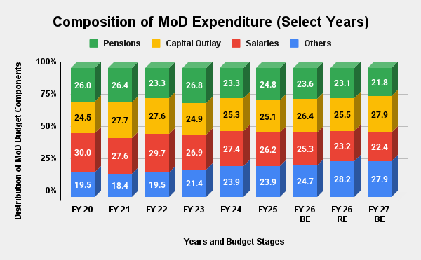 For years, defence analysts have warned that ballooning pension and salary bills were eating into the modernization budget. The composition of the MoD expenditure for FY 27 (see Figure 2) offers the first concrete sign that the tide is turning.