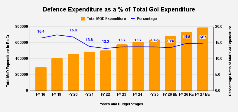The total Defence Budget has hit a record ₹7.85 lakh crore, constituting 14.7% of total Central Government expenditure for the FY 27 Budget Estimate (BE). While it hovers just around the 2% of GDP mark, the composition of this spending reveals a shift in India’s military planning, in that, for the first time in this decade, the focus has decisively shifted from revenue expenditure to capital firepower (though the ratio as a percentage of total Defence expenditure between capital outlay and salaries + pensions remains 27:43).