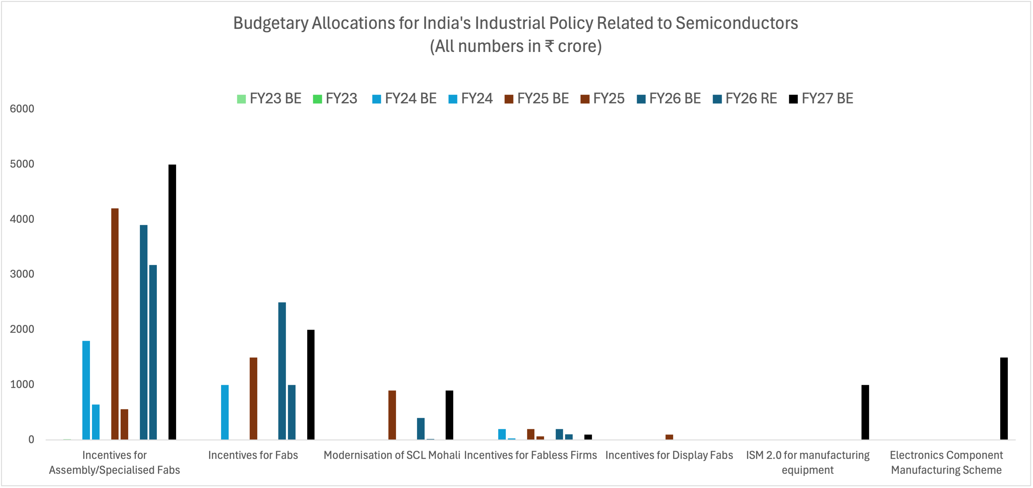 - The budgeted outlay for a fab shows a muted picture. Despite the budgeted allocations for the Dholera fab in FY24 and FY25, not a single penny was disbursed. The FY26 revised estimate is also substantially lower than the budgeted allocations. Thus, it indicates that the project is progressing much more slowly than the government’s own projections.