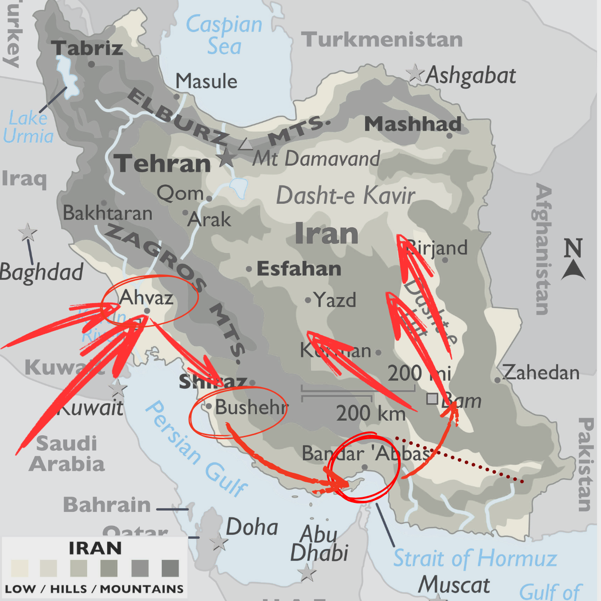 - The mountain ranges to the North and West would make a land offensive extremely costly, especially given that the Iranian Kurds have seemingly refused to join the US.