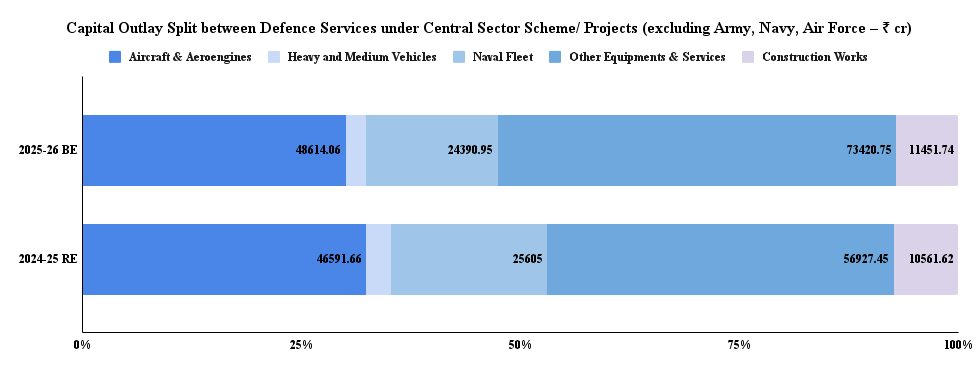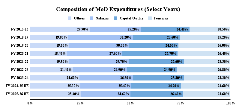 There is a noticeable imbalance between total personnel (salaries and pensions) and capital expenditure. For FY 2024-25 RE, the revenue to capital ratio is at 2.85:1, with a similar ratio at 2.63:1 for FY 2025-26 BE. The Parliament Committee has regularly expressed concern that the higher revenue expenditure may hinder the modernisation of the armed forces. However, there is also cognisance of the need to aptly maintain and operate the forces.