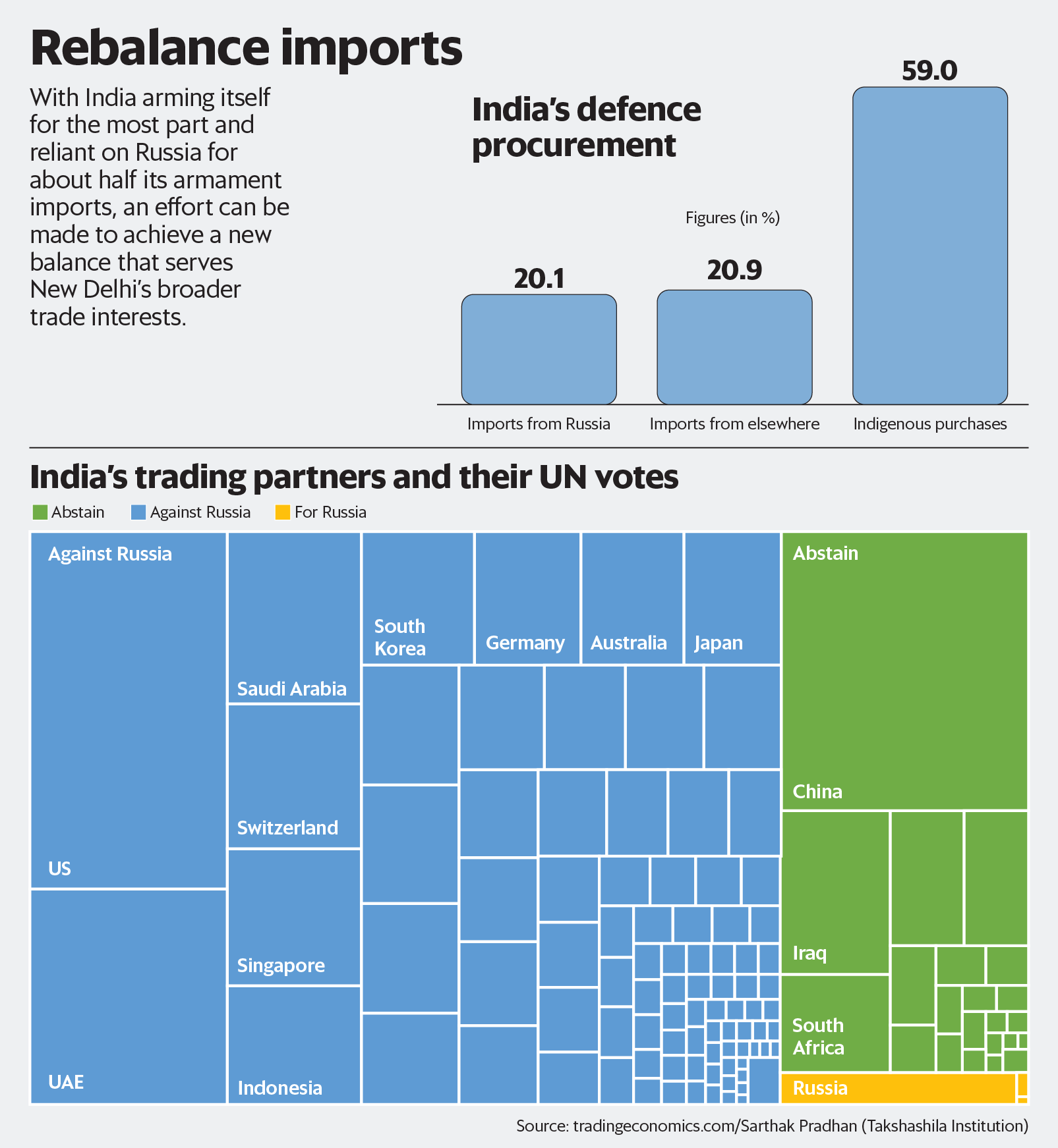 An oft-cited reason behind India’s fear of antagonising Russia is its dependence on Russia for military supplies. On closer scrutiny, we have argued that this is not as big an impediment as it is believed to be. First, due to economic sanctions and the war situation Russia’s ability to deliver on defence orders is already impacted and is unlikely to change in the near term.