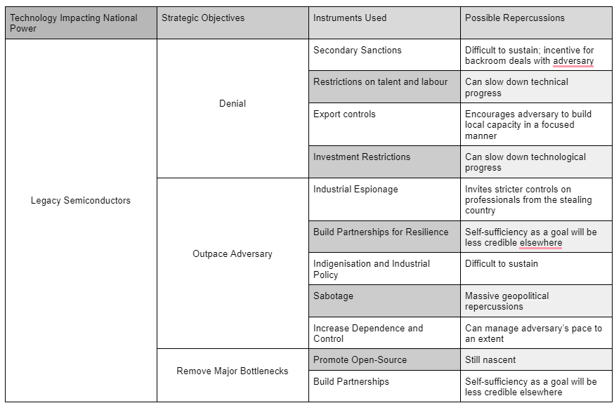 Assessing USA’s OptionsThe following framework provides a useful lens through which to analyse the range of instruments available to the US to address its dependency on Chinese legacy chips, both in the short and long term.