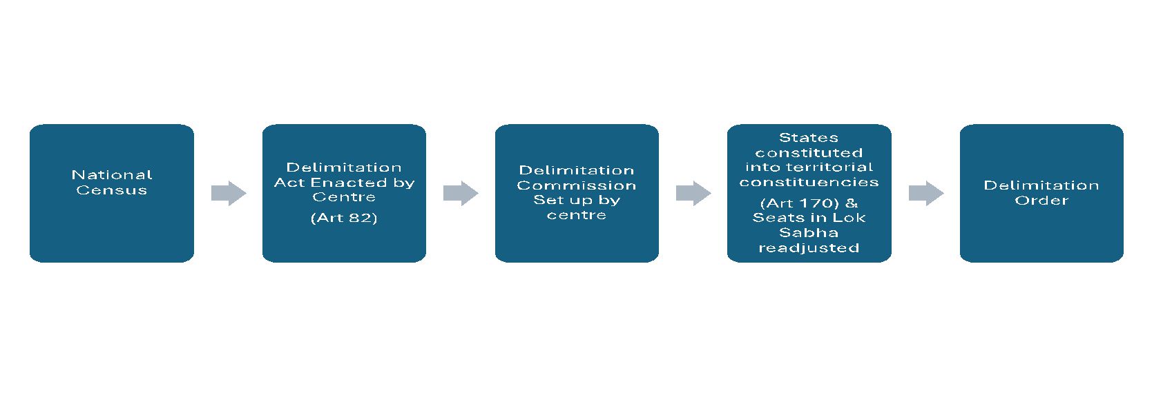 The process flows from National Census → Delimitation Act Enacted by Parliament → Delimitation Commission Set up by President → Seats Constituted into territorial constituencies → Delimitation Order