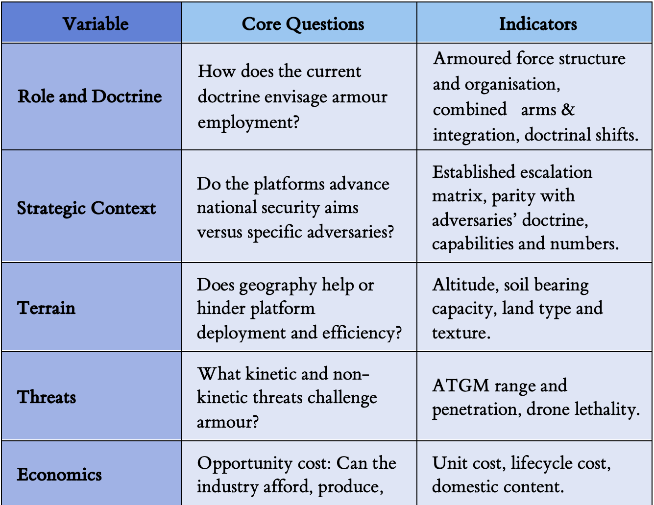 Thus, it is fair to say that the battlefield has evolved much faster than the MBT. Now the question arises: what is the future utility of the MBT for the Indian Army? The MBT’s value cannot be gauged by its firepower and traditional doctrinal role alone. At the same time, focusing solely on how much protection a platform like the MBT provides can result in overlooking the stress that an increase in fuel consumption can impose on logistics. Without answering the question of whether MBTs are still relevant or not, and to avoid simplistic judgements of obsolescence and relevance, we formulate a multi-dimensional framework to guide our analysis.