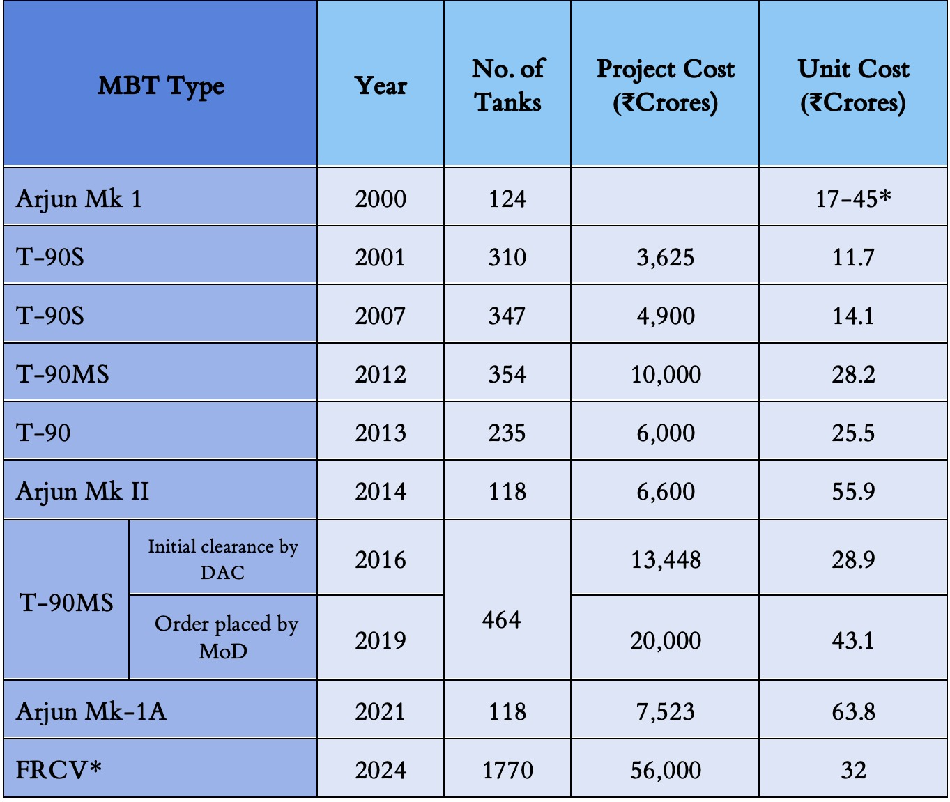 However, this cost appears to be a severe underestimation when compared to the past purchases/orders of T-90s tanks and Arjun tanks. The table below provides a cost comparison of projects over the past two decades.39