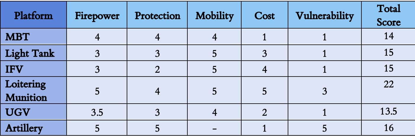 The following table offers a subjective assessment of various platforms that can either individually or in combination replace MBTs on the battlefield. Each parameter is awarded a relative score on a scale of 1-5. Better the firepower, protection (shield and armour) and mobility, higher the score. Alternatively, higher the vulnerability and cost, lower the score.