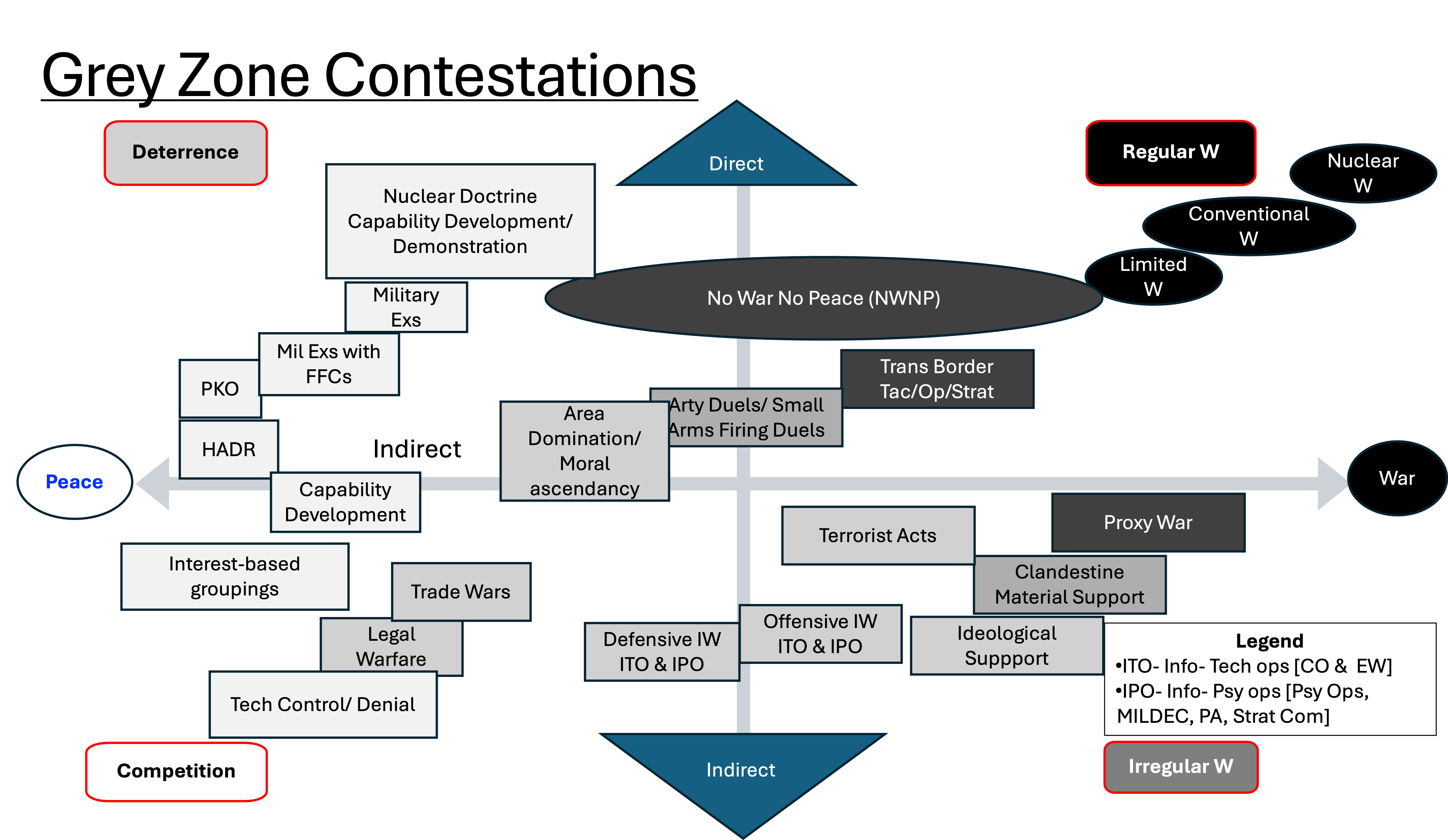This paper maps Grey Zone activities across a four-quadrant conflict model for analytical clarity: regular warfare, irregular warfare, competition, and deterrence.