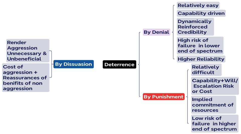 In the Indo-Pak context, India enjoys a marginal conventional advantage while Pakistan enjoys a definite advantage in the Grey Zone. India deters Pakistan by denial in the conventional space. It has gradually migrated to deterrence by punishment in the Grey Zone , whereas Pakistan attempts to deter India by denial in both the conventional and Grey Zone space.