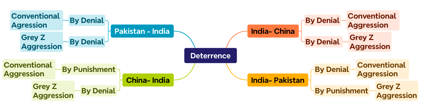 In the Sino-India context, there is conventional and Grey Zone asymmetry in favour of China. India deters China by denial, whereas China deters India by threat of punishment in the conventional space and by denial in the Grey Zone.