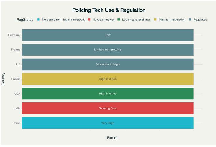 The graphic below provides details of the extent of usage and regulation of the AI based facial recognition and surveillance in policing across various countries.