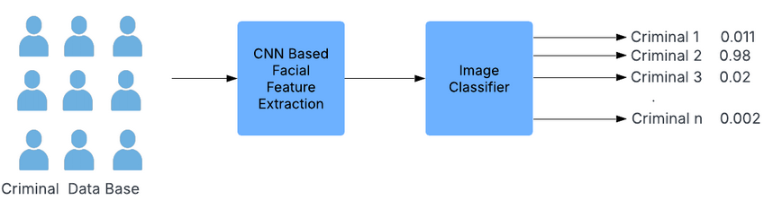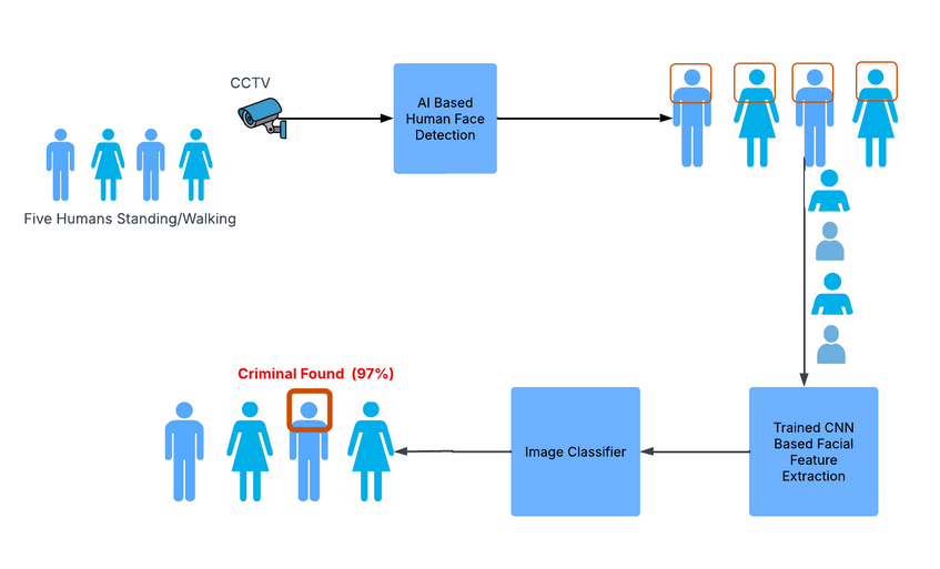 - Wanted Criminal Identification in Public Spaces An AI model is trained with the national criminal data base to detect a wanted criminal. The CCTV videos from various public installations are fed to the AI model in real time, which detects human faces, extracts features, and predicts whether the person is a wanted criminal or not.4 When a person of interest is recognized by an AI model, it warns the police personnel to take action.