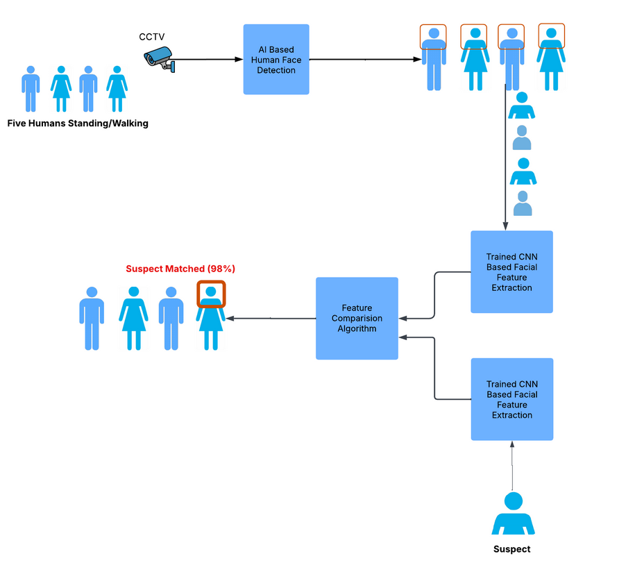 - Suspect Identification or a Missing Person Identification in Public Spaces. Here, the CCTV videos are fed to an AI model, which is trained to detect the human faces. Further the faces of humans in the video and the face of the suspect or a missing person are fed to the AI model that has been trained to extract facial features, The widely used technology here is a Convolutional Neural Network (CNN).5 The facial features of a target person are compared against the others to match the identity with a certain degree of confidence.