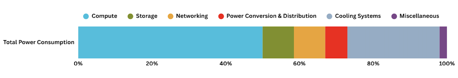 A PUE of 1.6 implies that for every 1 watt of electricity used by IT equipment (compute), 1.6 watts of electricity is consumed by the entire facility. The following break-up is an approximation of how much power is consumed by compute and the other major components in a data centre11. These components are discussed in later sections of the paper.