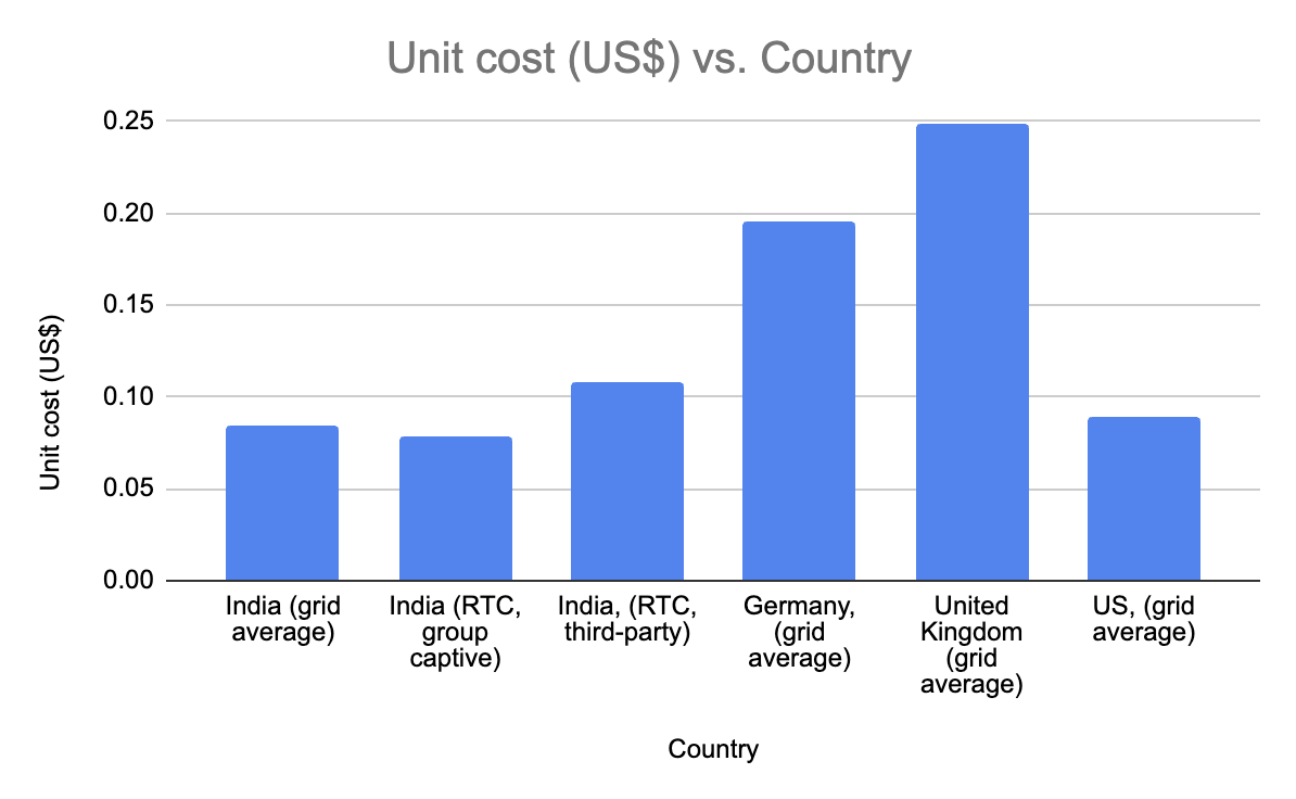 Table 3: Unit cost and annual cost of electricity in different countries, as prepared by Renuka Sane on ‘The Leap Blog’.49