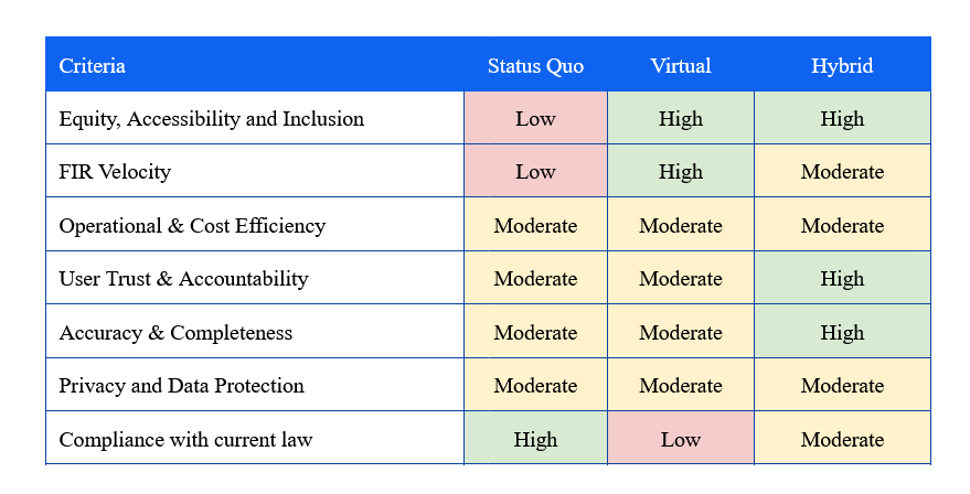 Alternatives have been evaluated on two parameters - levels of technology incorporated in the process, and identification of the right stakeholder(s) for efficient implementation. The selection criteria envisaged are a) equity, accessibility and inclusion, b) FIR velocity (total time taken to complete the FIR process), c) cost and operational efficiency, d) user trust and accountability, and e) accuracy and completeness. Privacy, data protection and compliance with law serve as essential boundary conditions that need to be met by all alternatives.