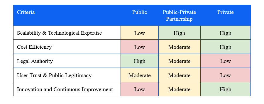 The involvement of private players is significantly beneficial in three criteria, namely a) Scalability & Technological Expertise, b) Cost Efficiency and c) Innovation and Continuous Improvement. Unlike government agencies, private firms possess specialised knowledge and are incentivised for continuous improvement and efficiency.