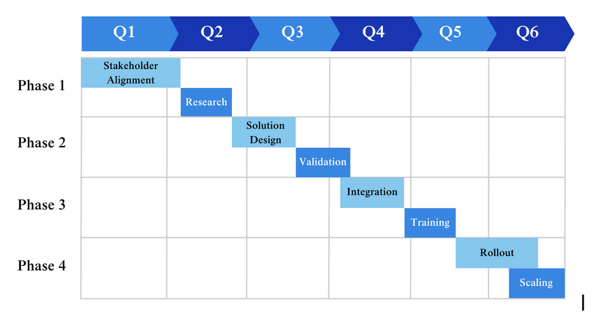The detailed breakdown of each phase, including its time-frame, core activities, desired outcomes, and success criteria, is provided below. Advancement to a new phase is contingent upon meeting the success criteria for all stages within the preceding phase.
