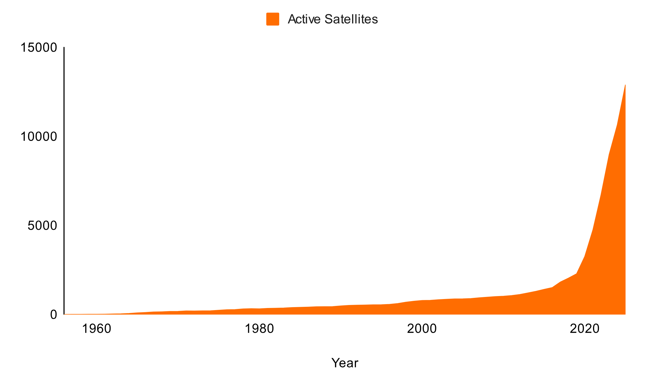 The unprecedented scale is reflected in the trends that show the number of active satellites over the years. In the chart below, we see a sharp spike in active satellites after 2018.