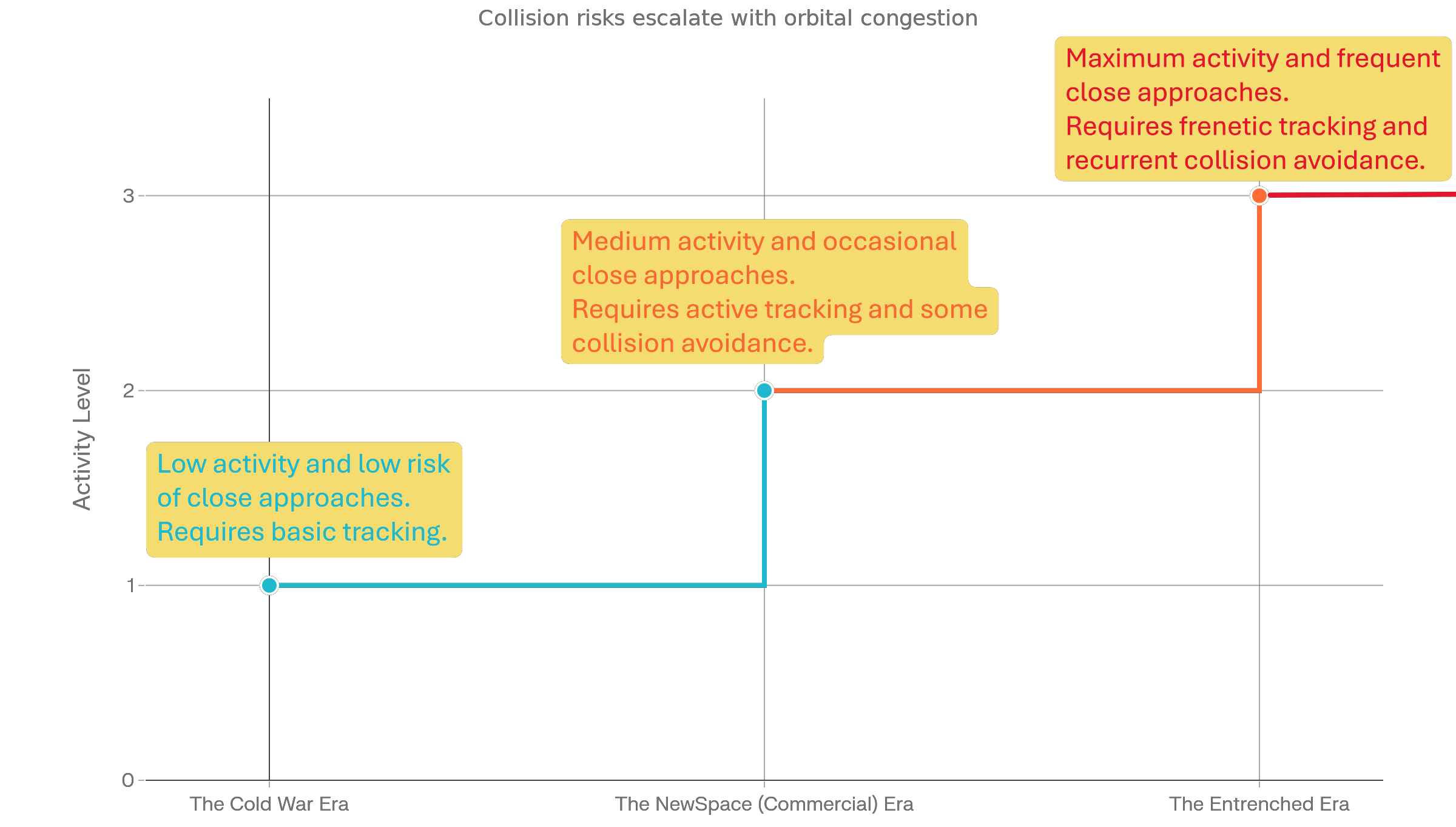 We are currently in a system where the margin for error is razor-thin. Models show that the 550 km orbit is now so crowded that a single collision could trigger an unstoppable chain reaction.25 All of these conditions raise the sophistication threshold required to launch satellites to LEO. It will become technologically, economically and politically costlier. If these trends persist, space operators with lower levels of capability may be unable to access and safely operate in orbit. The incumbents with more developed capabilities will enjoy a lead that may widen over time. This will force all later entrants to coordinate around them, accept tighter performance and safety constraints, or migrate to less favourable altitudes and inclinations. This operational reality imposes exclusivity and establishes entrenched interests in orbit.