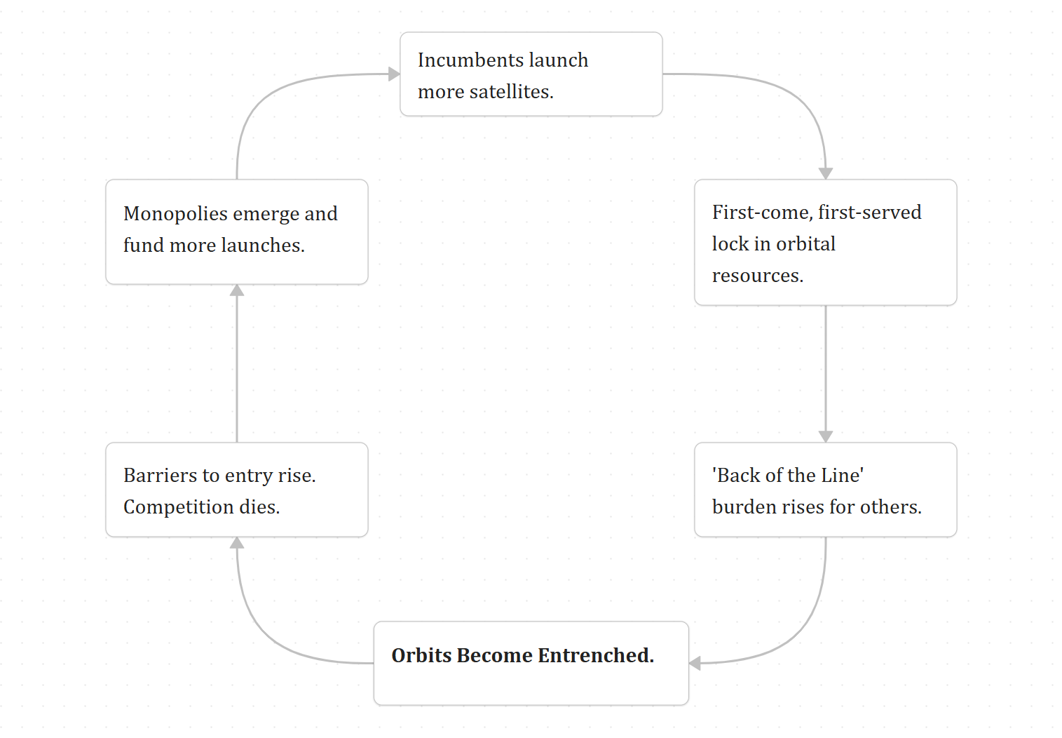 Importantly, this incumbency is effectively permanent. Operators can hold these rights in perpetuity as long as they continuously replace old satellites. This dynamic creates a ‘back of the line’ problem—locking out startups and future generations of the developing world from prime, low-orbit resources.