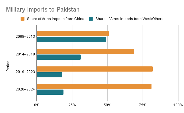 According to the Stockholm International Peace Research Institute (SIPRI), between 2019 and 2023, 81% of Pakistan’s arms imports came from China, a sharp rise from 69% in the previous five-year period.7 This made Pakistan China’s largest arms buyer, accounting for nearly 61% of Chinese arms exports. This deep dependence has shifted the relationship from traditional military ties to one of pronounced asymmetry, where Pakistan’s defence capabilities are heavily reliant on Chinese technology and support.