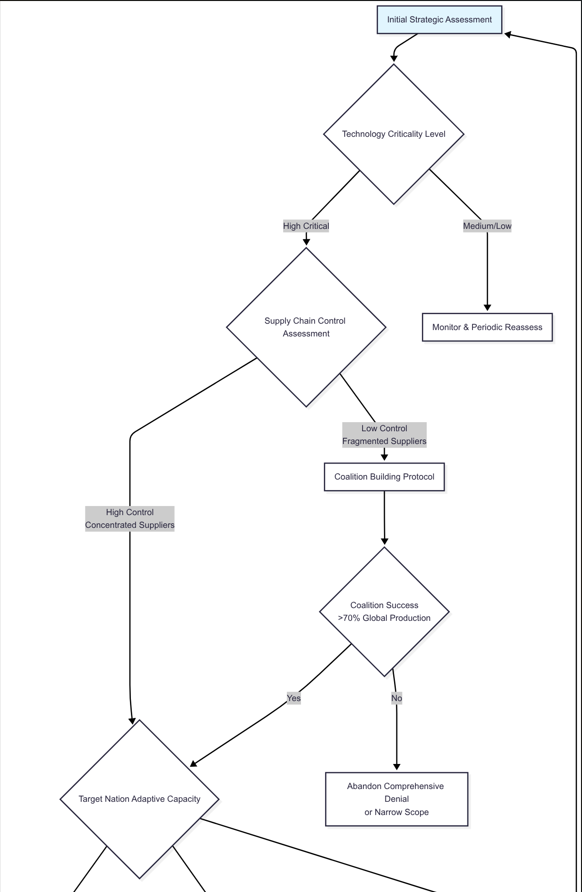 | High Supply Chain Control | The Iron Gate For instance: Nuclear technology denial regime Maximum Effectiveness: Complete technological isolation possible, with coordinated international effort creating comprehensive barriers. Long-term strategic advantage likely, with minimal circumvention opportunities for targeted countries. |