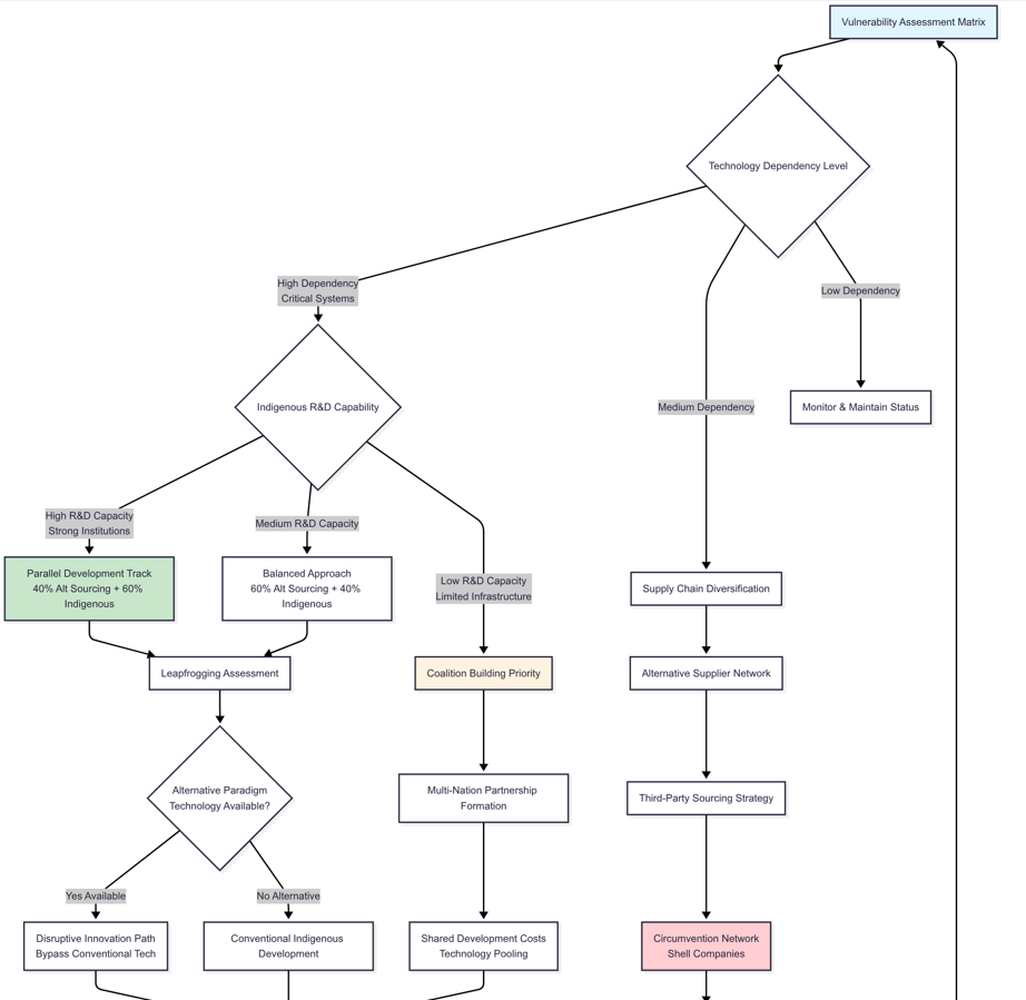 This matrix illustrates that countries with robust native R&D capacity and alternative partnerships access are most likely to withstand technology denial regimes. These countries can utilise both their indigenous development efforts, as well as external alliances, to bypass the constraints and potentially become more technologically independent than prior to when the regime of technology denial was enforced.