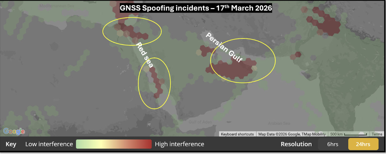 In addition to conventional threats, GNSS spoofing incidents have frequently been observed near straits of interest to India (see Figure 3), particularly in the Persian Gulf and the Red Sea, due to regional conflicts disrupting navigation. GNSS spoofing is the intentional manipulation of a GNSS receiver by broadcasting false signals to mislead it about its actual location, speed, or time. Indeed, the fake signals are usually much stronger than the original ones. Spoofing incidents are increasing in regions where anti-drone operations are conducted in conflict zones, and they are affecting civil aviation more significantly.19 These events can affect the location and navigation of the Automatic Identification System (AIS), which transmits its position via satellite. Furthermore, the number of spoofing incidents is a proxy for the number of drones in operation, and threats to vessels from drone strikes are evident in the ongoing conflict.
