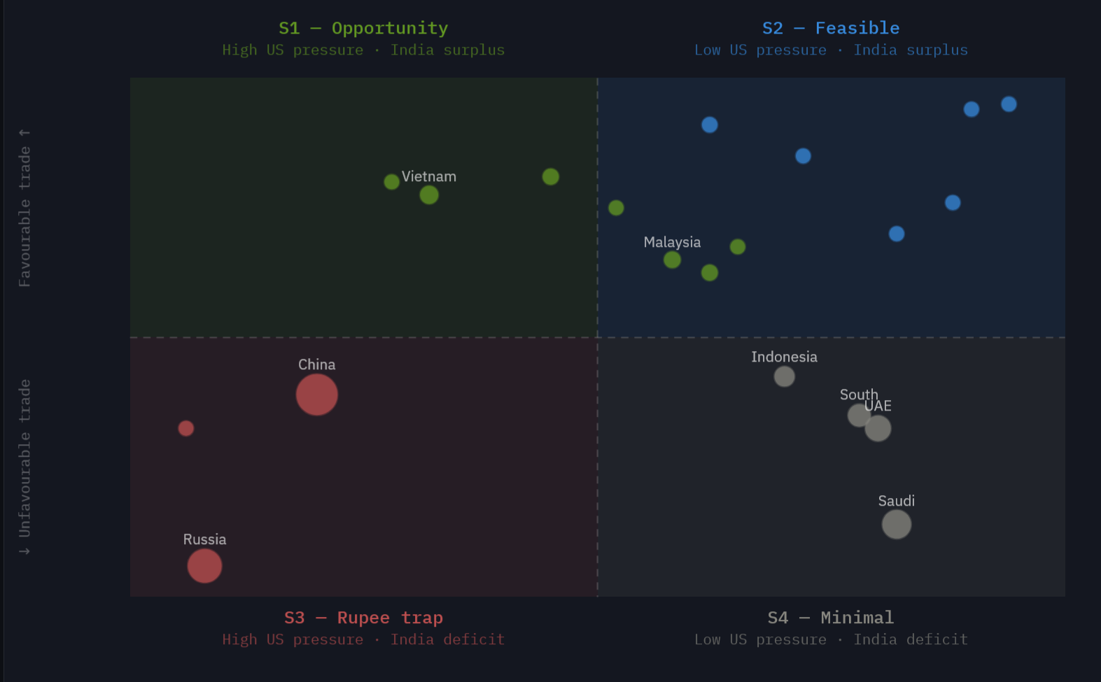 X axis: US trade exposure - left = High US pressure such as tariffs/sanctions, right = Low US pressure. Y-axis: Bilateral trade balance - top = Favourable where India has trade surplus, rupees can circulate, bottom = Unfavourable where India has trade deficit, rupee accumulation risk. Dot size = bilateral trade volume.42
