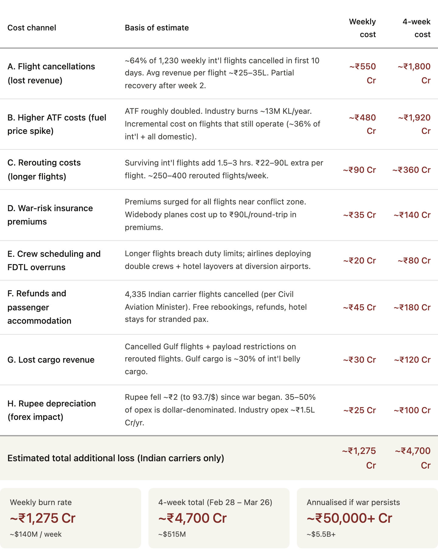 Rough estimates suggest that the additional loss to the Indian aviation industry could be ₹4,700 crores plus or minus 30 per cent. This estimate accounts for flight cancellations, fuel cost increases, rerouting, insurance, crew costs, refunds, lost cargo revenue, and forex impact across Indian carriers over the first four weeks of the conflict.