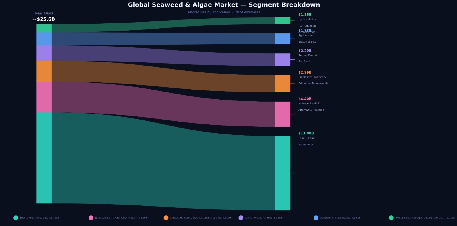 | Food & food ingredients | ~USD 12.4–13.6 billion | Derived as roughly 80 per cent of the USD 15.5–17 billion global seaweed market, based on the FAO/World Bank use split of 40 per cent direct human consumption + 40 per cent processed food use. |