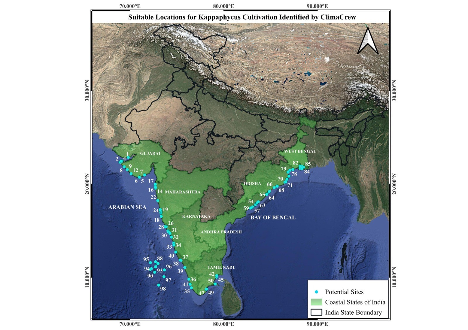 | State | No. of Sites (ICAR-CMFRI) | No. of Sites (CSIR-CSMCRI) | Potential Area (hectares) |