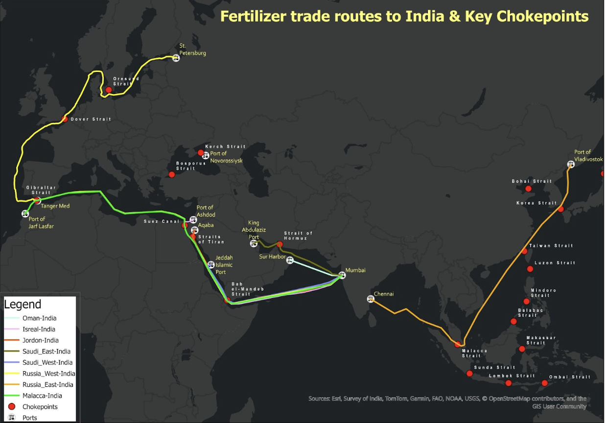 India’s dependence on imported fertilisers — approximately 18 million tonnes annually — exposes the country to significant geopolitical risk through its reliance on vulnerable maritime chokepoints. This paper maps the supply chains, shipping routes, and chokepoint exposures for India’s three primary fertiliser nutrients: Nitrogen (Urea), Phosphorus (DAP), and Potassium (MoP). Key supplier nations include Saudi Arabia, Morocco, Russia, Canada, and Jordan, with shipments transiting critical chokepoints such as the Strait of Hormuz, the Bab el-Mandeb, the Suez Canal, and the Strait of Malacca. The paper documents growing threats to these routes, including armed conflict, Houthi attacks, and GNSS spoofing incidents, while also flagging the risks of concentrated supplier dependence. In response, the paper proposes a layered strategy: in the short term, diversifying sources and routes and expanding strategic reserves from the current 30–45 days to 60–90 days of supply; and in the long term, reforming India’s deeply distorted fertiliser subsidy structure by bringing urea under the Nutrient Based Subsidy framework, phasing out subsidies over a decade, and deploying precision agriculture technologies to reduce overall demand. The paper argues that addressing both external supply vulnerabilities and domestic demand distortions is essential for India to achieve durable fertiliser security.